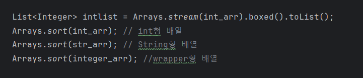 Wrapper 타입이나 int형 기본형 배열들은 Arrays.sort(배열) 함수로 배열이 가능하다.